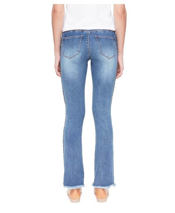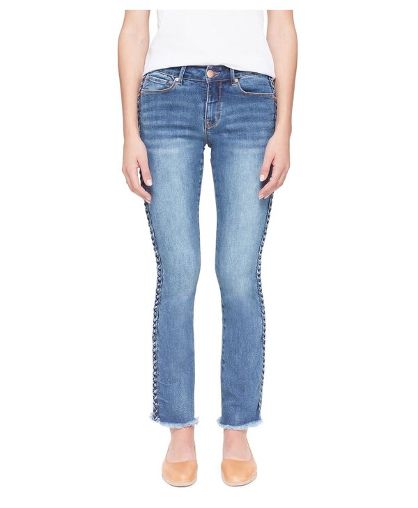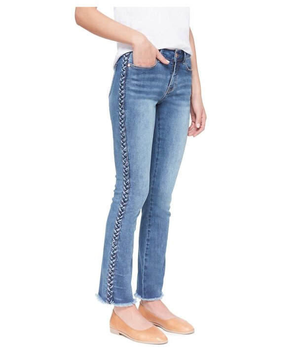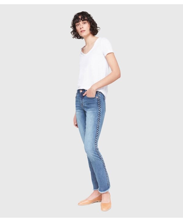 Cut for a relaxed look, this Mid-Rise Straight jean features a braided side detail for an elevated look. Featured in Stone Blue with a frayed hem—wear yours with everything from feminine tops to casual tees.